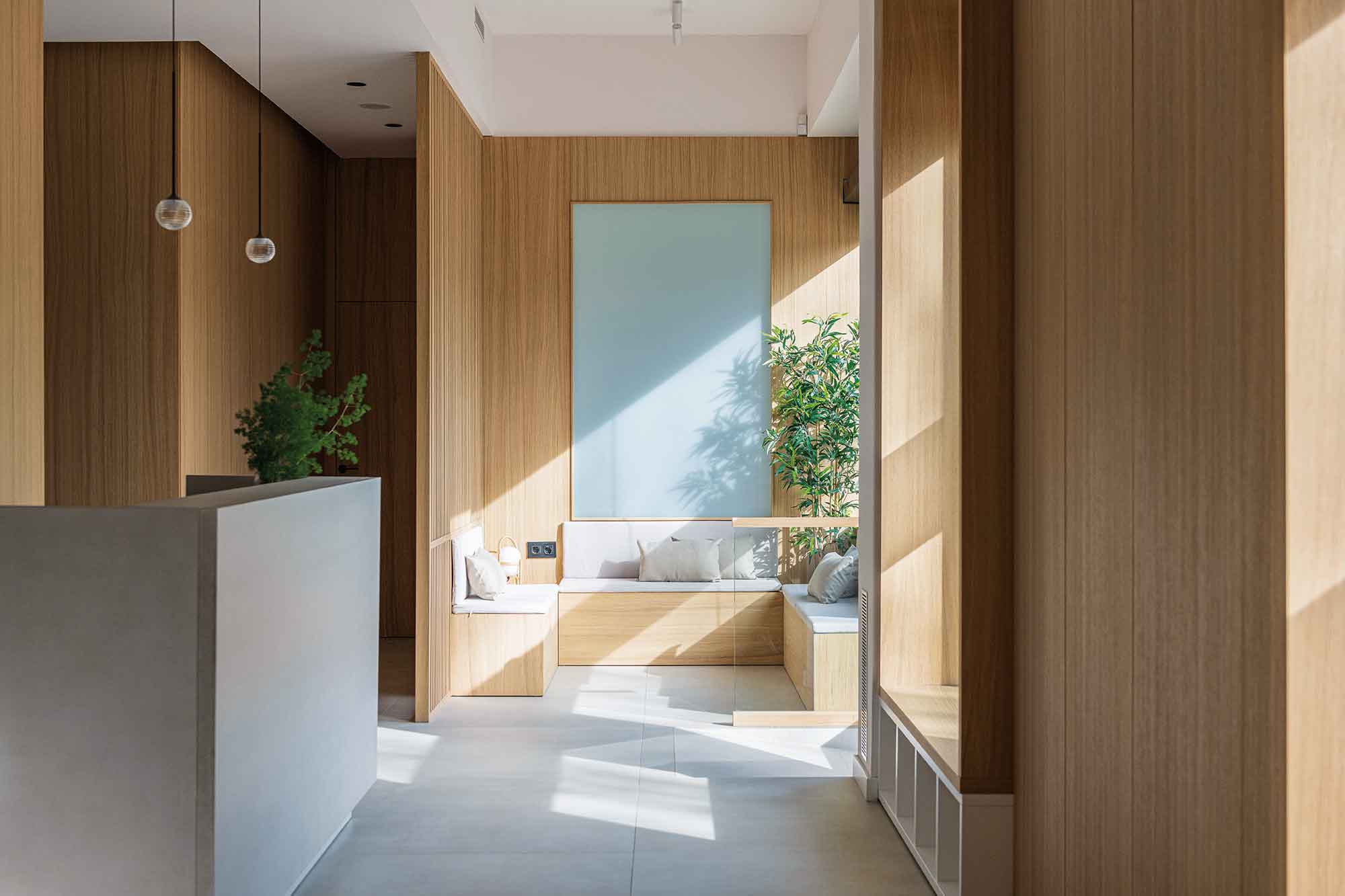La mayoría de los elementos están diseñados a medida para adaptarse totalmente al espacio. Las salas de espera se realizaron con bancadas a medida sobre las cuales se proyecta una celosía de listones para dar intimidad y separar la zona del resto de los espacios.