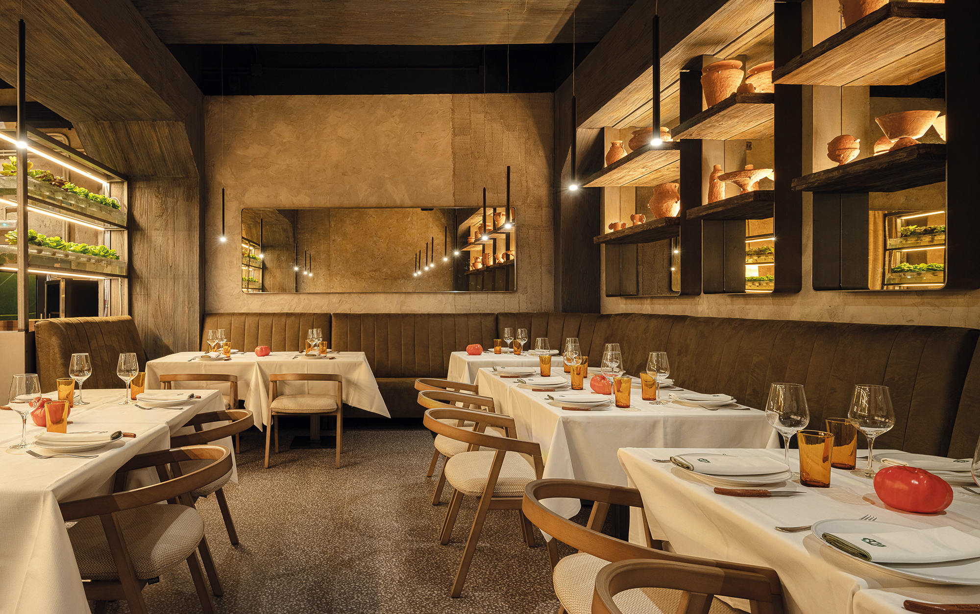El tono de barro del suelo se despliega con juegos geométricos desde la entrada hasta el final de los ocho metros de barra, cubriéndola con detalles de las mismas teselas de color. El tono tierra intensifica su color, tostándose hasta ennegrecer en los espacios elevados que rodean la barra, acercándose a la cocina característica de Floren. Frente a la barra preside un espacio privilegiado desde la altura que permite disfrutar de este gran lugar de doble altura, desde unos sinuosos bancos tallados en microcemento, acomodados por cojines de telas de hilo trenzado en tonos naturales.