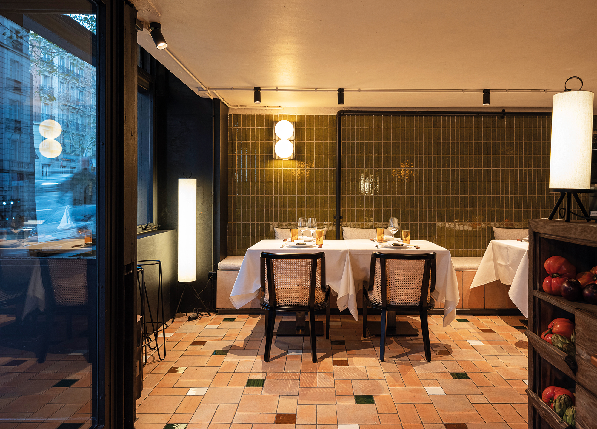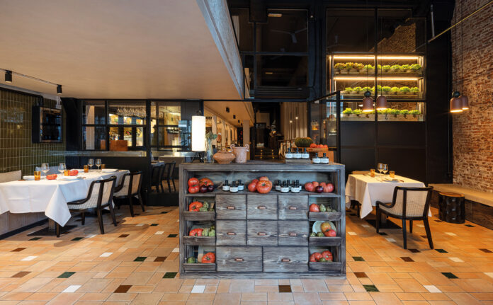Este espacio de bienvenida se recrea bajo una alfombra de material porcelánico de tesela de colores, que contrasta con la sobriedad del mobiliario negro y de madera natural de tono desgastado y ahumado. Preside el primer gran jardín de lechugas frescas, junto a la gran chimenea de acero, sobre una gran pared original de ladrillo de doble altura, frente a alicatado tradicional verde de pequeñas piezas que guiará hasta cubrir toda la trasbarra. Un gran mueble lleno de producto recibe a los clientes, rodeado de verduras de temporada.
