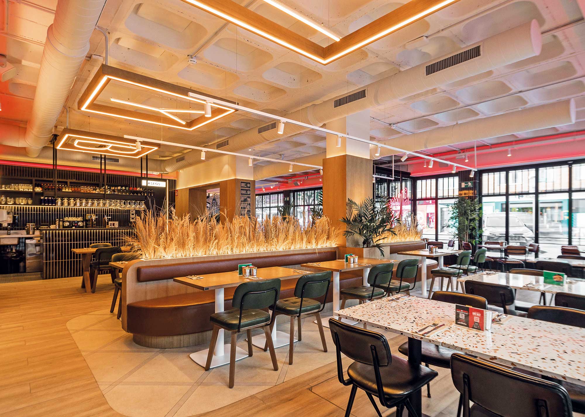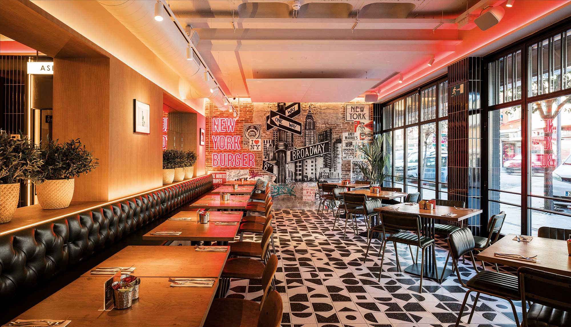 La distribución interior del restaurante se ha planificado meticulosamente para garantizar una experiencia óptima para los clientes. Siguiendo la filosofía de New York Burger, la zona de servicio se ha colocado en la parte trasera del local, liberando una gran sala para los comensales. Esto no solo permite que el espacio interior se abra hacia el exterior a través de los ventanales, sino que también crea un ambiente acogedor y espacioso para disfrutar de las deliciosas hamburguesas y otros platos característicos de la cadena.