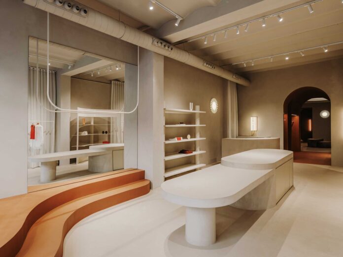 Al pasar a la zona principal de la tienda, un túnel envolvente actúa como transición hacia el siguiente espacio. Este túnel se distingue por su acabado terracota, un color que se repite en varios elementos del espacio para generar continuidad. Después de cruzar el túnel, el usuario entra en un área de la tienda con una estética onírica y única. Dado que la tienda se encuentra en Barcelona se ha incluido una zona para eventos y presentaciones. Se han diseñado unas gradas curvas de obra que evocan las de un anfiteatro. Una gran apertura circular en el techo irradia una luz suave a través de una tela retroiluminada, contribuyendo a la atmósfera de ensueño. Bajo esta luz cenital, se encuentra una escultura de Sara Regal que funciona como una mesa baja de exhibición. Esta pieza fue creada a partir de escombros generados durante la reforma, destacando nuevamente los principios de sostenibilidad que definen a la marca.