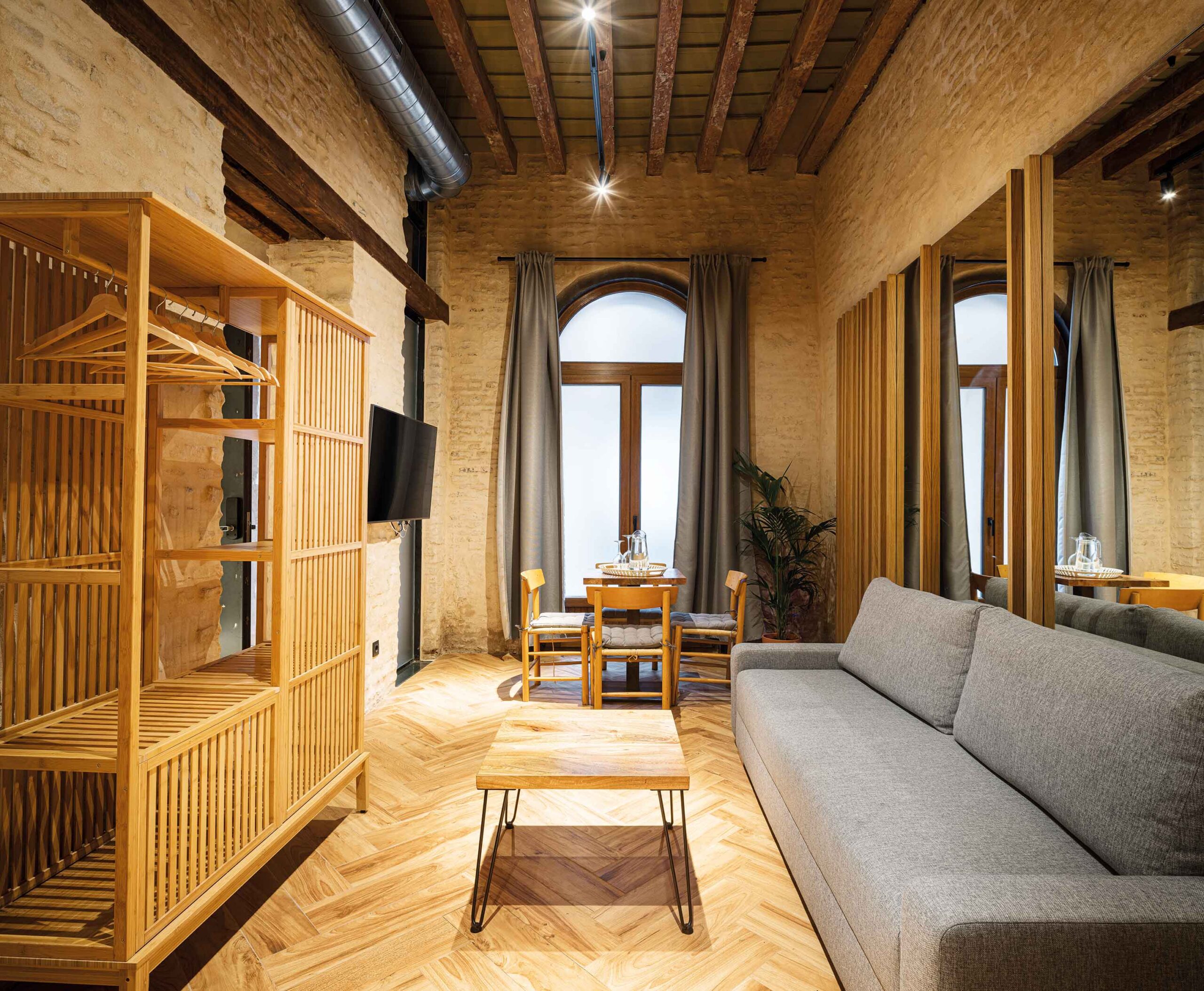 Castilla 91: Esta promoción de catorce apartamentos, ubicado en Triana, tiene fachada a dos importantes calles del barrio, las calles Castilla y Alfarería. Interiormente, los apartamentos tienen una imagen actual, con un especial cuidado por el diseño de todos los detalles, mobiliario e iluminación. El espacio de salón-cocina se plantea muy luminoso y blanco, en contraste con un dormitorio en tonos oscuros, con presencia de elementos textiles que busca una atmósfera acogedora, todo ello complementado con una iluminación tenue que invita al descanso. Fotografías: Antonio Arévalo, Juanca Lagares.