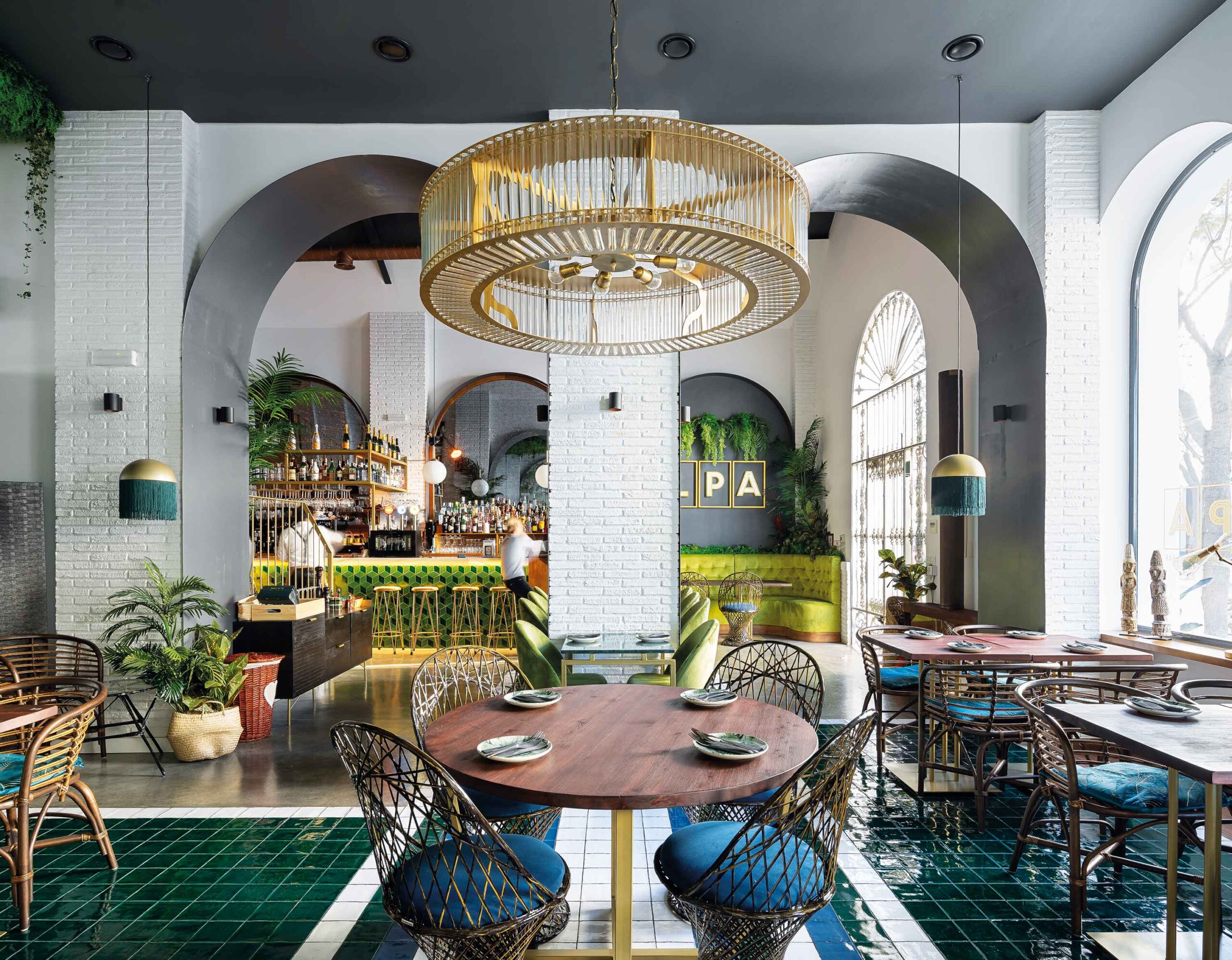 LPA The Culinary Bar: El local presenta dos zonas bien distinguidas, dos mundos. En el derecho se encuentra la zona de barra y coctelería, más informal, mientras que en la nave izquierda está el comedor más grande. La cocina por otro lado, atraviesa las dos naves en la parte trasera, por lo que permite el paso de personal a las dos zonas de manera independiente. Fotografías: Juanca Lagares.