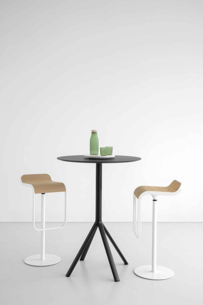 La colección outdoor de Lapalma vive también más allá del invernadero, en un espacio que interpreta el ambiente de una elegante terraza, donde algunas de las mesitas altas propuestas por la empresa se combinan con taburetes de diferentes modelos como los Lem con asiento de madera de iroko.