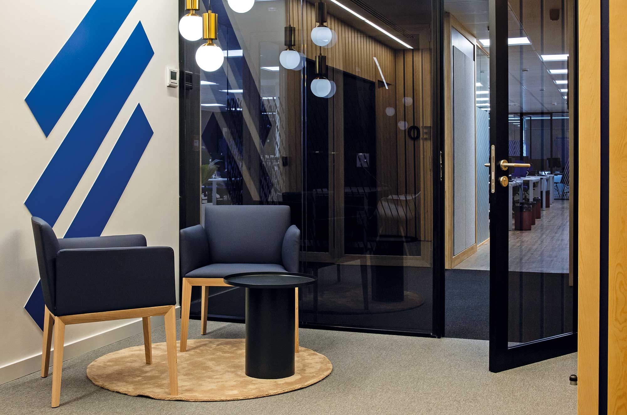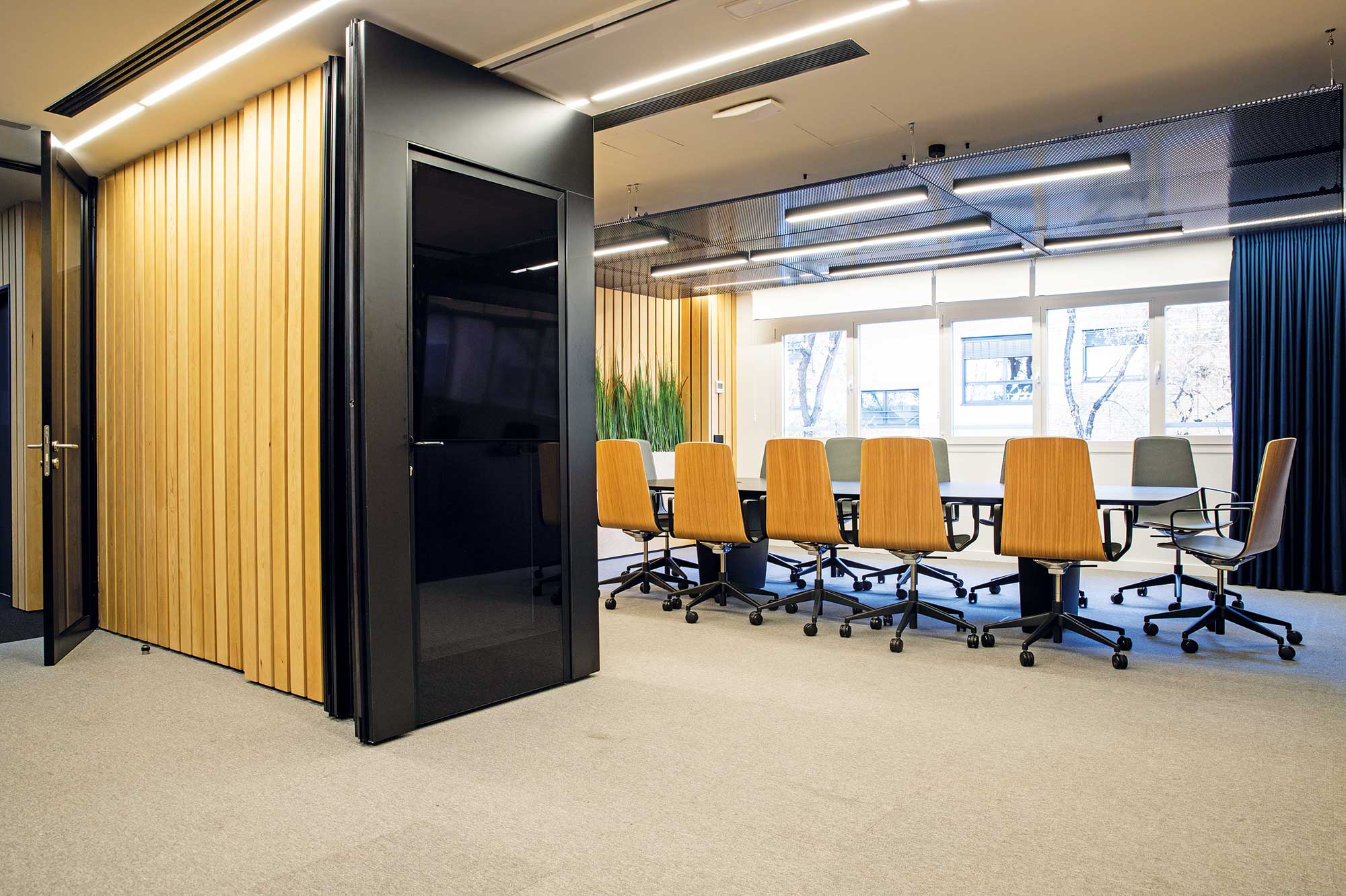 La sala de presidencia es un espacio representativo de la empresa y debe reflejar su cultura, valores y éxito. Para 118 Studio, la clave era encontrar un equilibrio entre la funcionalidad, elegancia y la comodidad para crear una atmósfera profesional y acogedora. Se ha logrado embellecer las paredes mediante el uso de madera, creando así una imagen armónica con el resto del espacio.