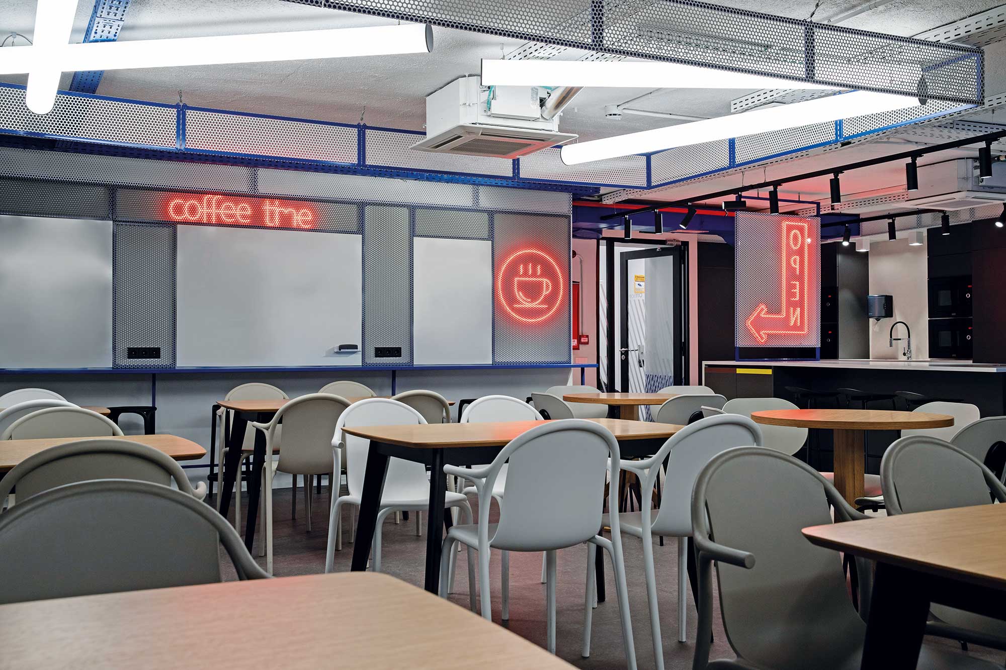 En una segunda etapa se remodeló la planta cero emplazando nuevos espacios de reuniones y una sala polivalente de 72m2 que puede ser destinada a múltiples usos. Se ha querido mantener una coherencia estética con el resto del edificio incorporando detalles decorativos con un carácter propio. Entre ellos se incluyen falsos techos continuos con iluminación led empotrada para proporcionar sensación de profundidad, paneles móviles con revestimiento acústico y distintos componentes de la arquitectura en el color azul corporativo para reforzar la imagen e identidad de la empresa.