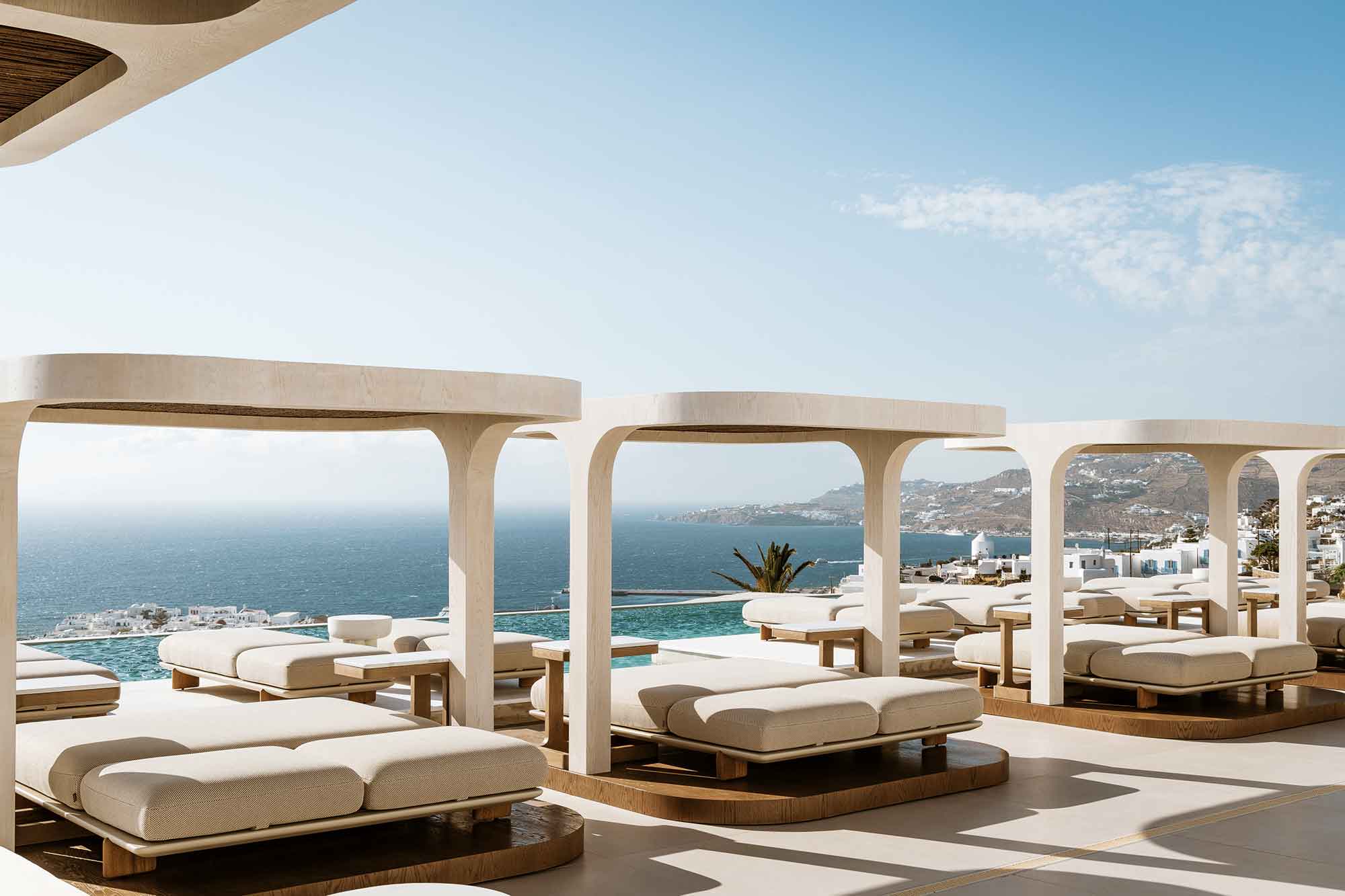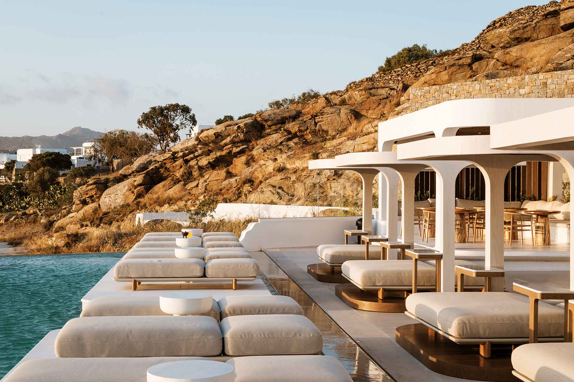 En él, las tumbonas y daybeds de la colección Milos de Vondom transforman el área de la piscina en un lugar de paz y elegancia, permitiendo a los huéspedes disfrutar del sol griego y de las impresionantes puestas de sol que caracterizan a esta isla.