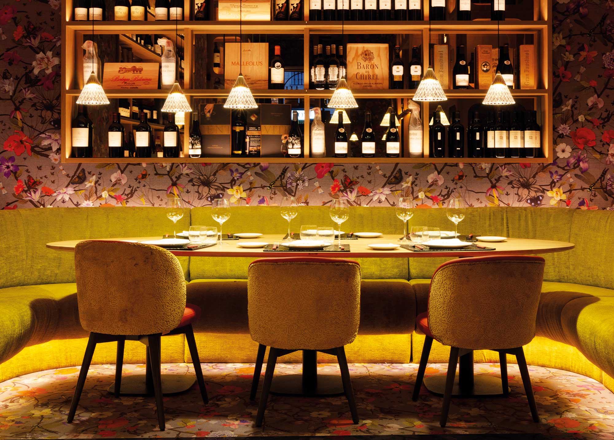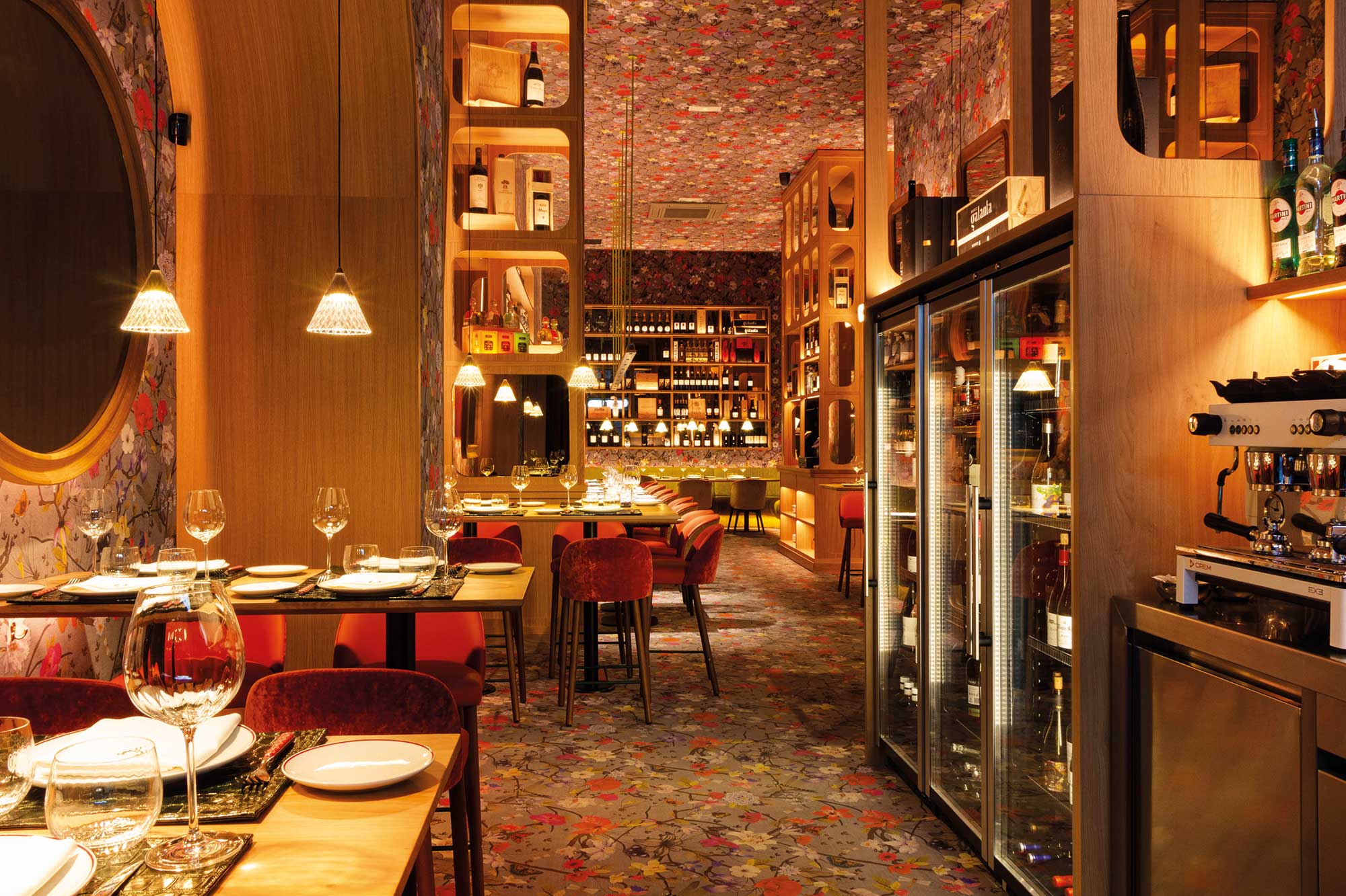 A esa calidez se unen también las tapicerías de las sillas, la madera natural de las mesas y los muebles y, por supuesto, la iluminación, basada en luces puntuales que enmarcan o destacan los puntos fuertes del espacio. Además, el diseño del restaurante rinde un potente homenaje al vino, que está presente en todos los rincones del restaurante a través de fabulosas vitrinas de madera y retroiluminadas donde se muestra la excelente bodega. Estas estructuras retroiluminadas van de suelo a techo, creando una sensación de mayor altura y añadiendo un plus de elegancia.