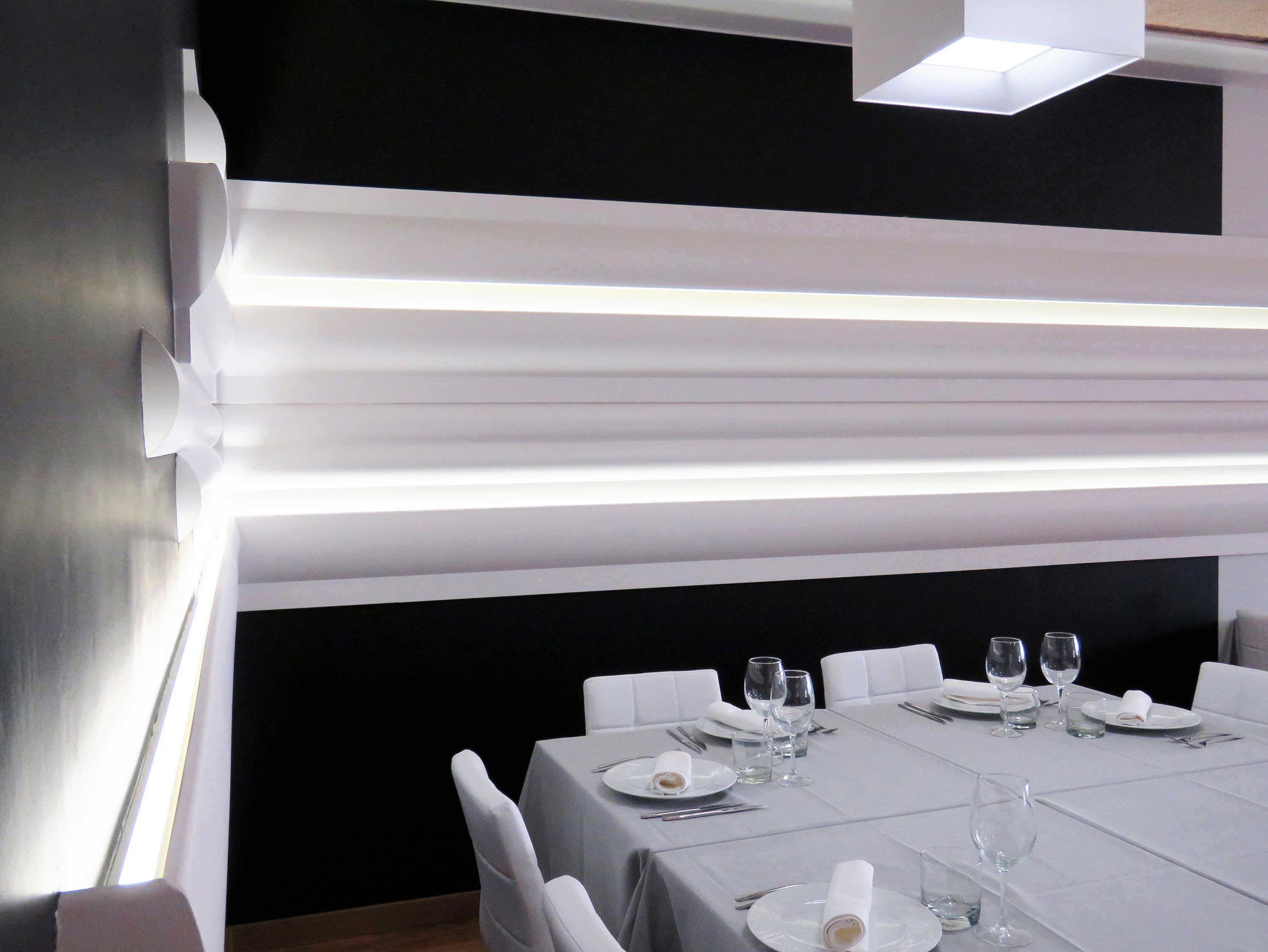 El nuevo restaurante Tasta’m en Ondara (Alicante) destaca por un interiorismo de estilo futurista, acromático, protagonizado por la horizontalidad de distintas molduras y cornisas blancas que han sido brillantemente combinadas con dos grandes haces de luz led en las paredes. En este proyecto de diseño interior se ha logrado otorgar gran dinamismo al local, gracias a la sinuosidad de las formas. La potente combinación de tiras de iluminación led con la cornisa Fluxus y la versátil moldura Radius, ambas realizadas por el prestigioso diseñador Ulf Moritz para Orac Decor, otorga gran profundidad al espacio. En este conjunto, la tonalidad blanca gana todo el protagonismo a las paredes oscuras.
