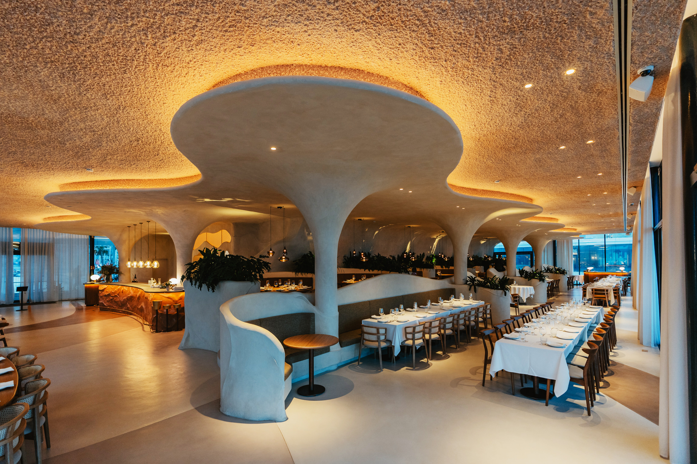 Los paramentos verticales del restaurante están revestidos con mortero de cal proyectado sobre mantas de cañizo, mientras que los techos acústicos se basan en un proyectado de celulosa. Además, el uso de madera de pino radiata en las estructuras ocultas permite aligerar peso y masa en todo el volumen. “Cada uno de los materiales y demás elementos utilizados han sido cuidadosamente seleccionados para reducir la huella de carbono y teniendo en cuenta los volátiles y formaldehidos, la durabilidad y el mantenimiento, para así garantizar el mínimo impacto ambiental posible. Nuestro objetivo ha sido crear un espacio que no solo sea visualmente atractivo, sino también responsable”, comenta el diseñador. Y es aquí, dado que el proyecto ha sido diseñado teniendo en cuenta criterios medioambientales rigurosos, donde Lamp también ha jugado un papel clave al proporcionar soluciones lumínicas que complementan la apuesta por la sostenibilidad en todas las fases del proceso.