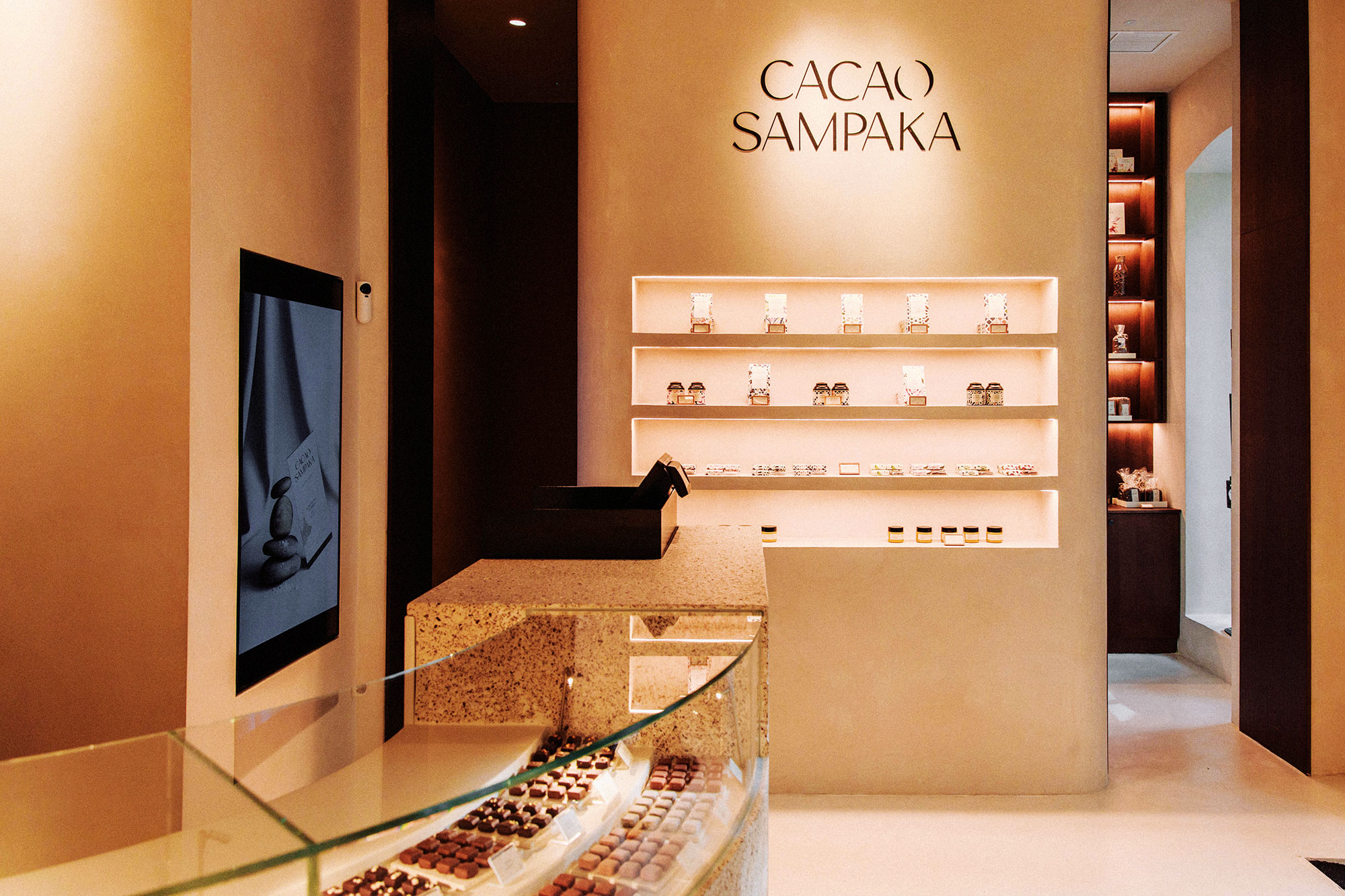 En el proyecto de Cacao Sampaka, los materiales fueron clave. Diseñamos una envolvente para todo el local que destacaba el producto –en este caso, chocolates y bombones–. En el mostrador utilizamos un material hecho a medida, compuesto por cacao natural.