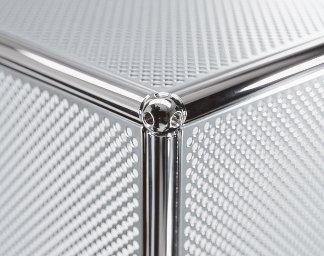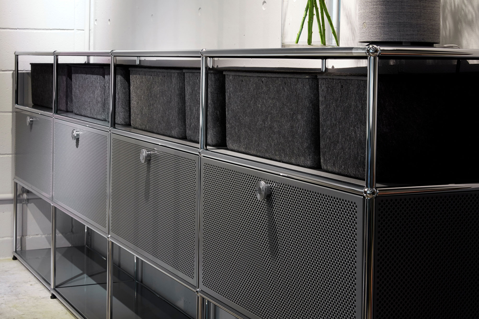 Más decisivo aún, es el volumen del elemento insonorizante, es decir, el espacio de almacenamiento rodeado por los elementos de puertas y las paredes laterales o posteriores de un mueble. En un archivador o aparador USM Haller acústicamente optimizado, es el volumen del espacio el que aumenta la absorción por el material acústico. El volumen de aire encerrado actúa como un cuerpo de resonancia en un instrumento musical que en este caso tiene un efecto de absorción, incluso cuando el mueble está lleno.