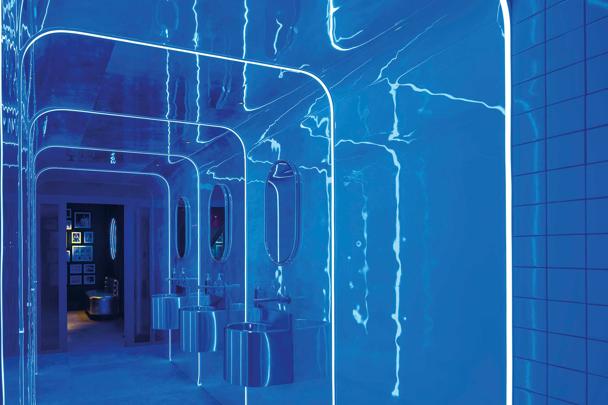 Repartido en dos plantas y con una superficie cercana a los 300 m², el interior se organiza como un escenario futurista, donde predominan los acabados brillantes, los elementos curvos y una paleta cromática que recuerda a paisajes lunares o estaciones orbitales. El espacio fluye con naturalidad, gracias a una cuidada planificación de recorridos, accesos y puntos focales.