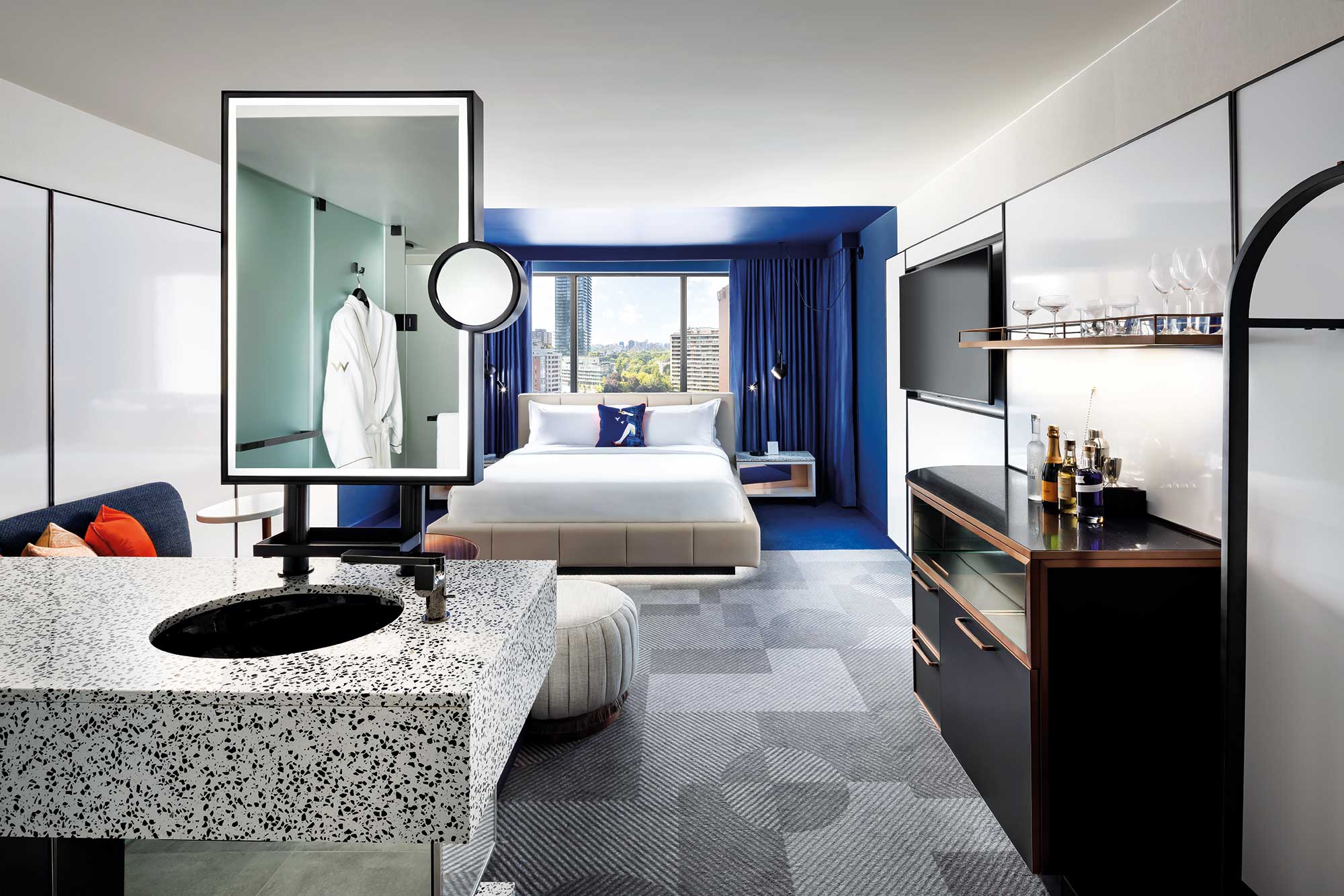 Las habitaciones se ubican alrededor de los jardines que rodean el cubo de vidrio de La Sala de Estar, las habitaciones de huéspedes en el W Toronto son sorprendentes debido a su diseño único. El espacio está compuesto por dos áreas distintas: una privada y la otra más social. En un cambio respecto a la configuración habitual de la habitación de hotel, la cama se coloca frente a la ventana y está adornada con cortinas cálidas, iluminación suspendida y un marco azul profundo que se extiende por el suelo y las paredes.