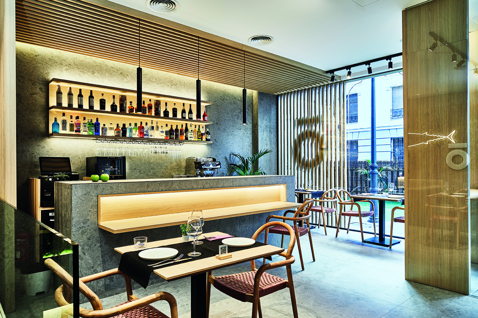 La planta baja se desarrolla desplazando la zona de sala al frente, próxima a los nuevos escaparates, dotando a dicha zona de iluminación y largas visuales. Las zonas de servicio (cocina y aseo) se empujan al fondo del local donde las necesidades son menores. La barra se ubica próxima al acceso, y se presenta como un tótem monolítico enmarcado por una palilleria de roble, que recibe a los comensales y permite una visión panorámica del local. Al otro lado un panelado de madera conduce a las escaleras y a las zonas de servicio.