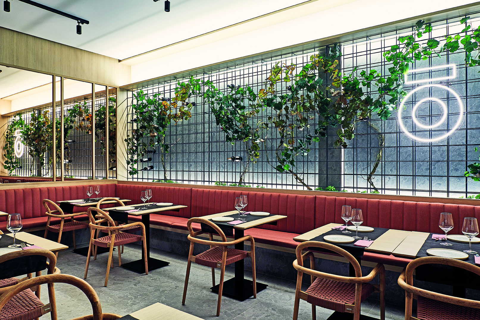 La materialidad en este trabajo es algo primordial, basando en ella, la unidad del conjunto y dando sentido a todo el proyecto. Por tanto, la paleta de materiales se reduce exclusivamente a tres. Porcelánico, que recubre todos las paredes y suelos del local, generando esa idea de estar dentro de una roca tallada y dando continuidad a toda la propuesta. Madera de roble, que aporta calidez a los espacios y enmarca los espacios singulares. Vegetación, que asiste de naturalidad y frescura al local.