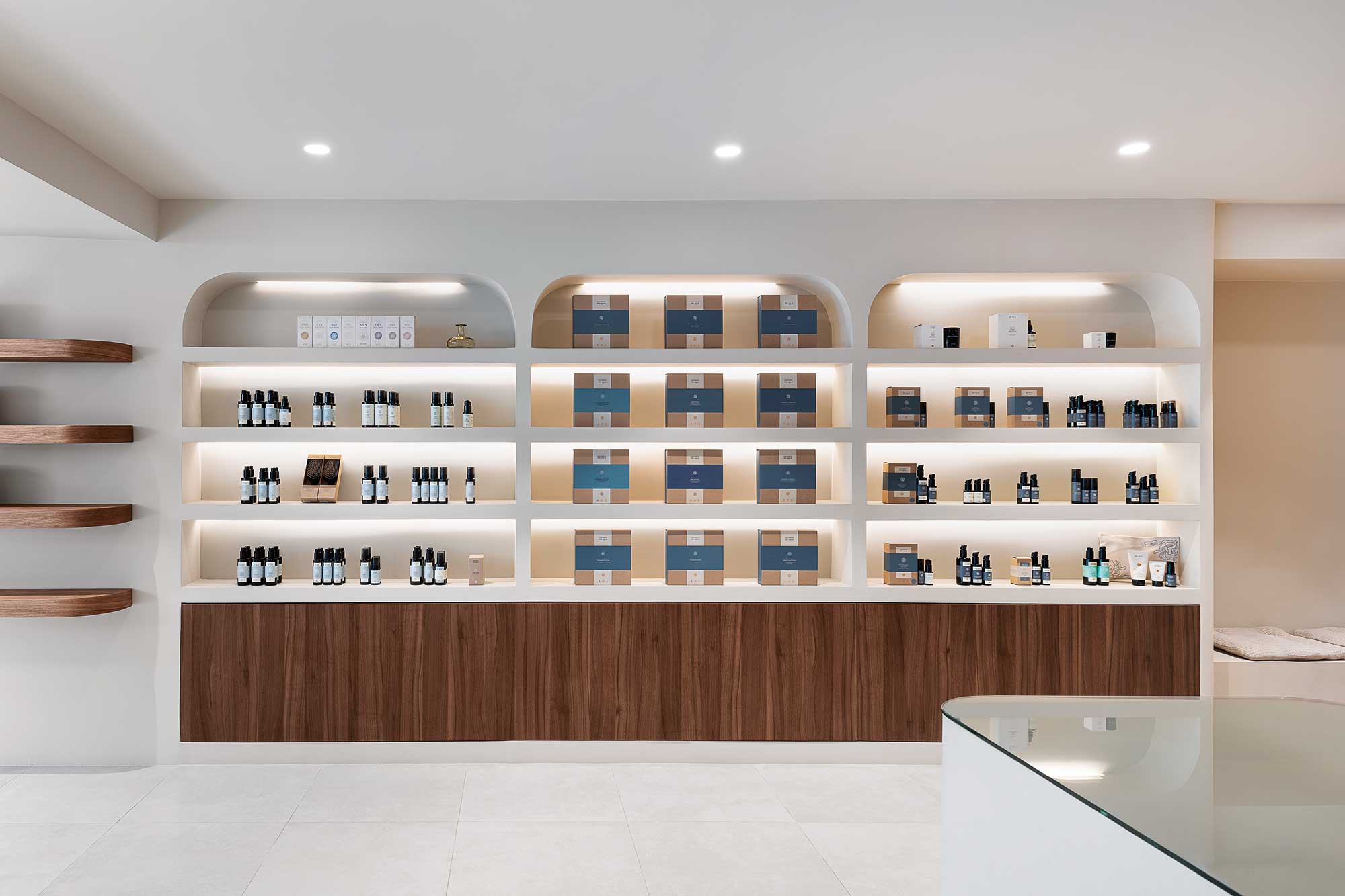 La distribución se organiza en dos plantas: la planta baja, donde se encuentran la boutique y la peluquería, y la planta sótano, que alberga una cabina de estética y una sala multifuncional para actividades como pilates y yoga. En la planta principal, el mostrador de recepción ofrece una bienvenida discreta y da privacidad a los usuarios en la zona de peluquería. La boutique, diseñada con estanterías a medida, recuerda una biblioteca y combina la madera con muebles en tonos piedra, creando uniformidad y calidez.