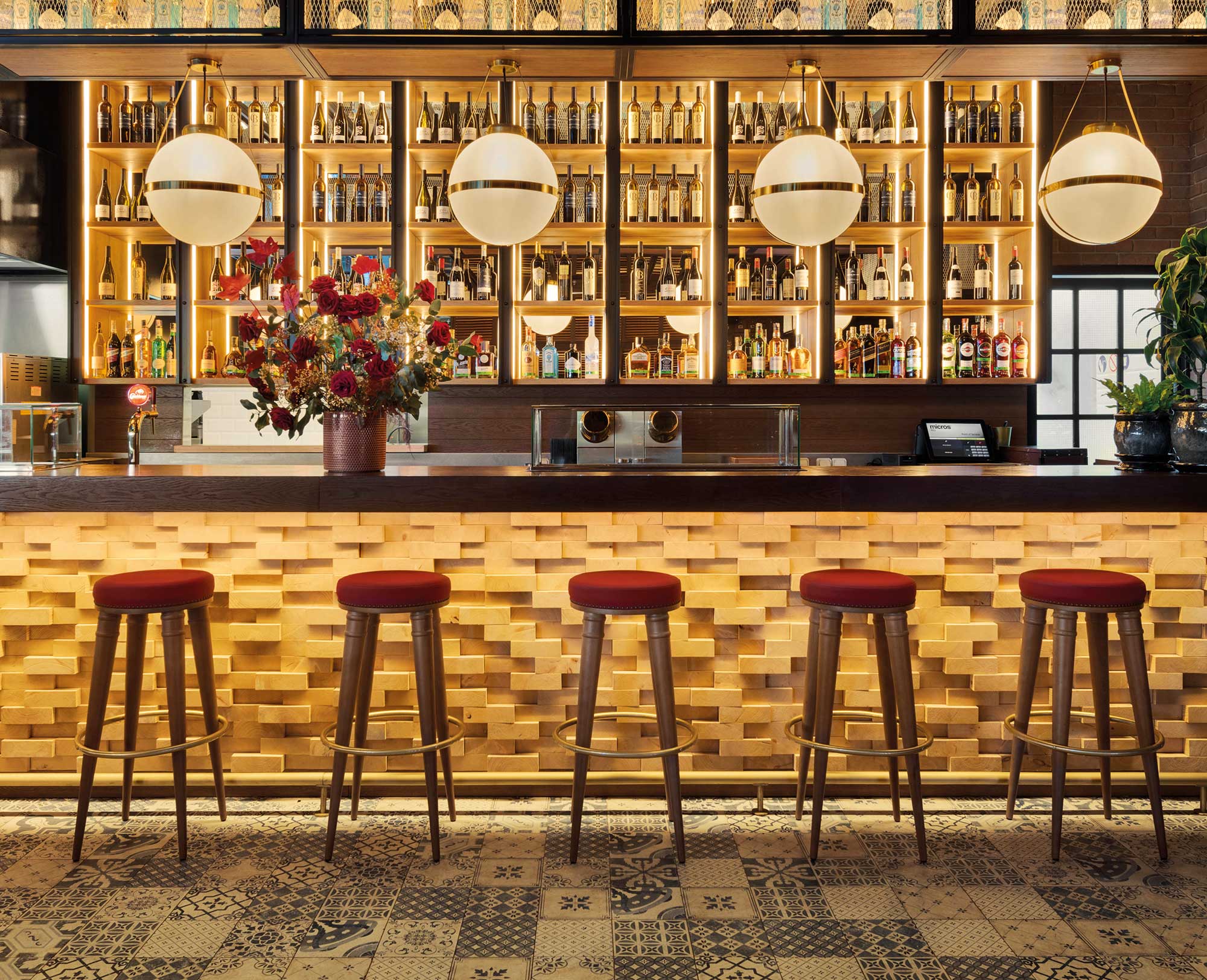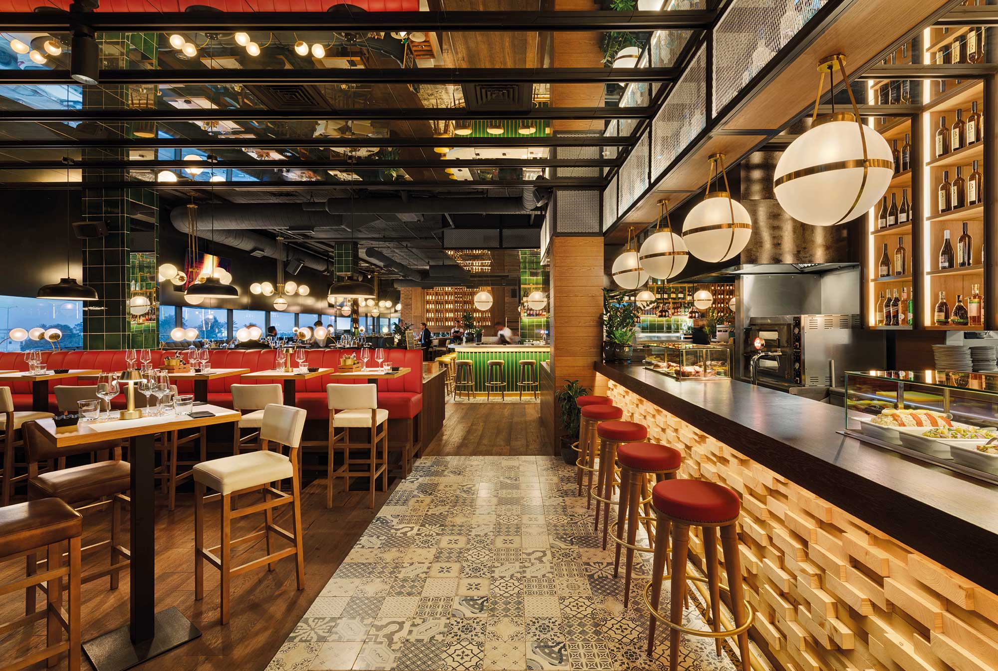 Al entrar al local, se encuentra un mueble de recepción y tras él una gran pared revestida con falsos cajones que evocan una gran biblioteca de época. Junto a ella, un inmenso armario ropero retroiluminado donde los comensales pueden guardar sus abrigos y pertenencias, y un techo revestido de espejos plata para darle profundidad en altura al local. La barra, hecha de tacos de madera de pino y con una superficie de madera de nogal, está vestida en su trasbarra con altísimas estanterías de madera de nogal, iluminadas lateralmente con leds y repletas de productos. La dimensión de la barra se amplía gracias a los espejos que la acompañan a lo largo de su recorrido, formando un pórtico que pasa por el techo y abraza la zona frontal de la barra y los sofás altos. Todo esto se corona con un carácter industrial otorgado por el hierro y las rejillas deployé pintadas en blanco.
