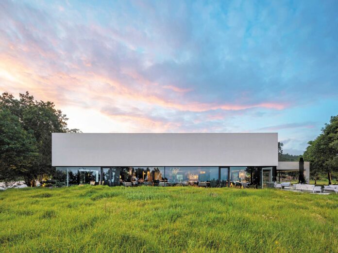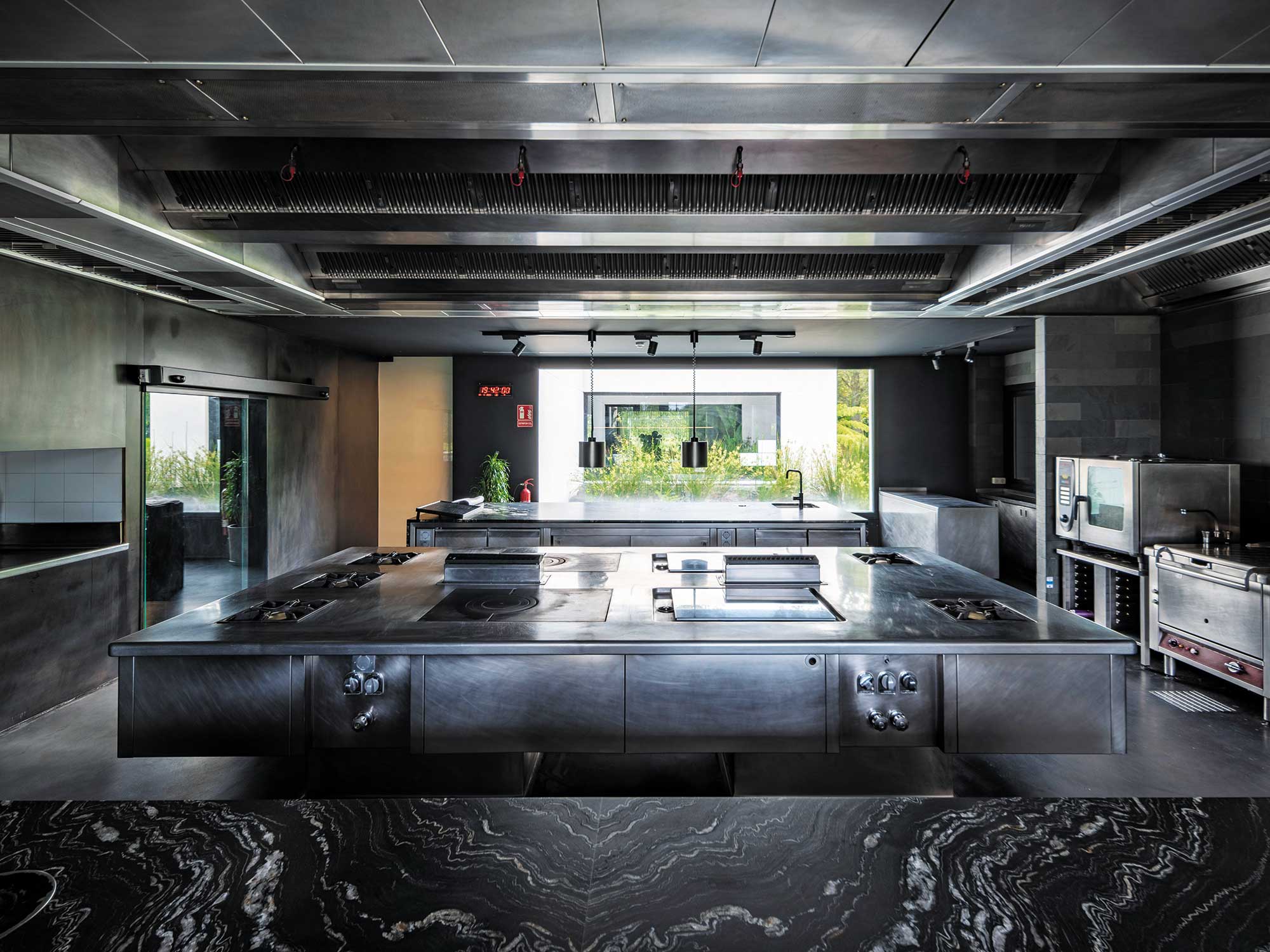 Entre las zonas de trabajo del complejo se encuentra la cocina I+D, un espacio creativo en el que el equipo de cocina puede reunirse para reflexionar y desarrollar nuevas propuestas culinarias. Además, ofrece al chef la posibilidad de recibir y atender a colaboradores, amistades y clientes de una manera más informal y personalizada, en contacto directo con la naturaleza circundante.