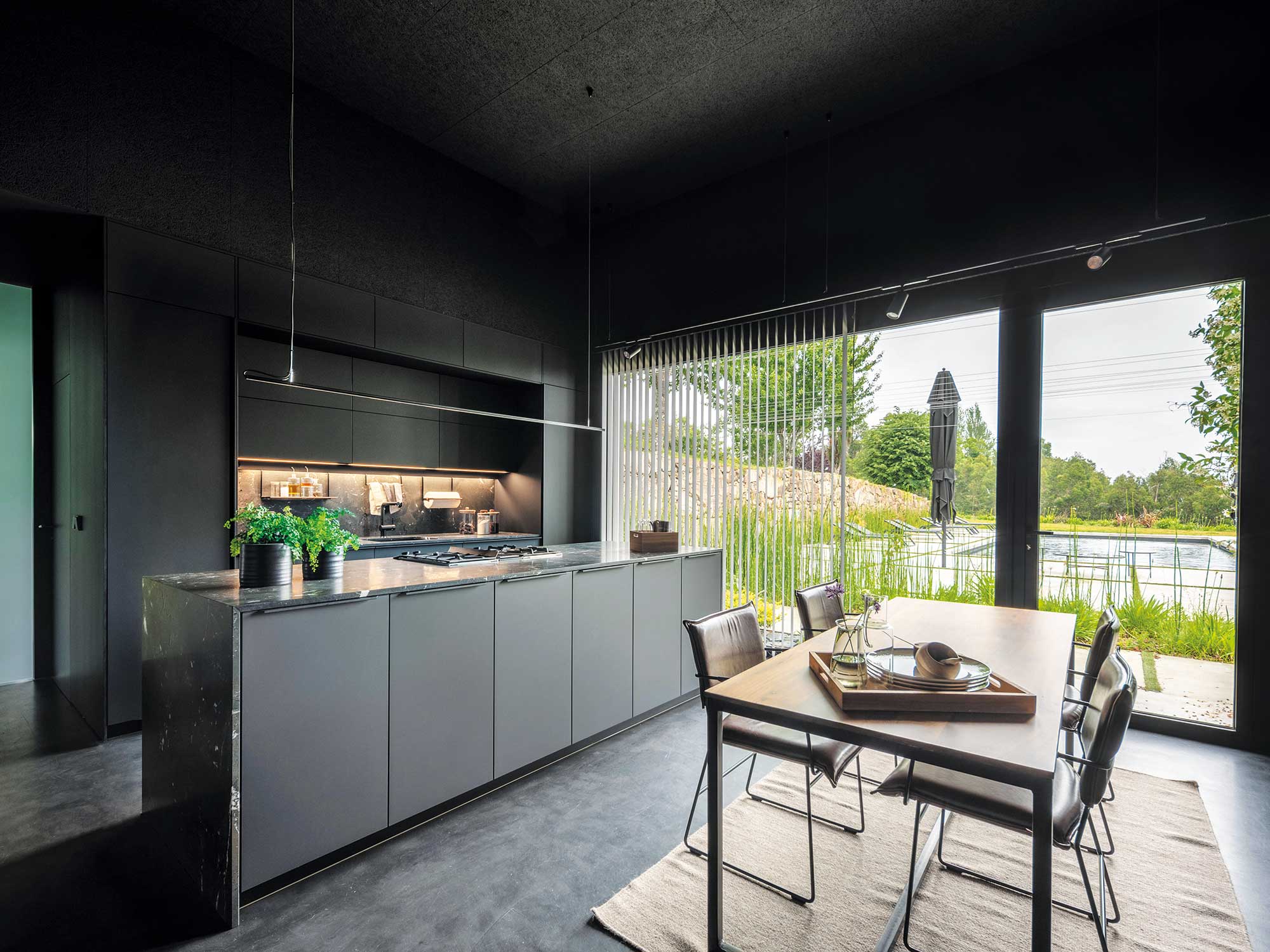 Para equipar el espacio de cocina I+D, los arquitectos optaron por un diseño Fine de Santos en acabado Negro Seda, un color que encaja con la concepción general del proyecto. Detrás de la isla se ha ubicado un lineal de mobiliario que, en su parte central, acoge la zona de fregado, con grifería y fregadero de Blanco en acabado negro. La parte baja se ha equipado con dos amplios cajoneros y un módulo portafregadero dotado de cubos de reciclaje en la gaveta inferior.