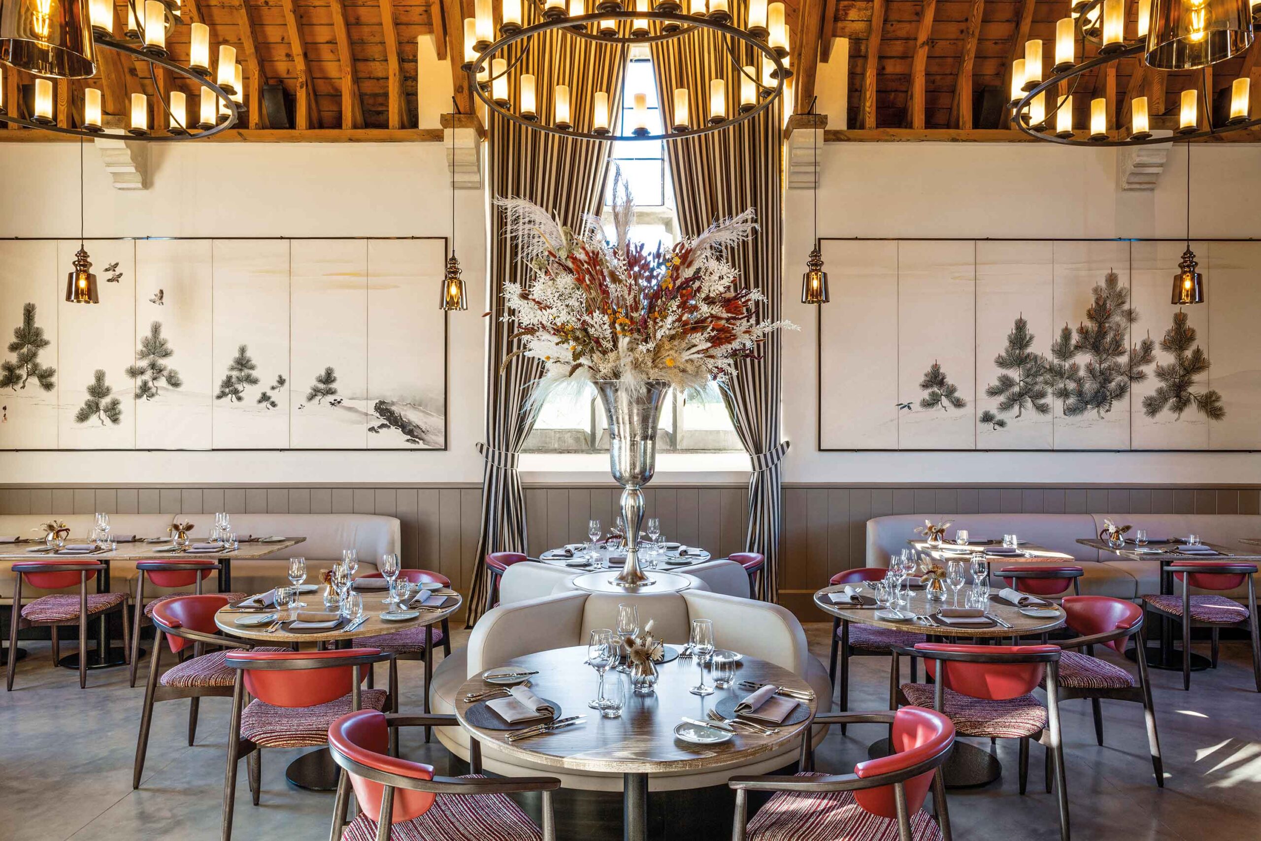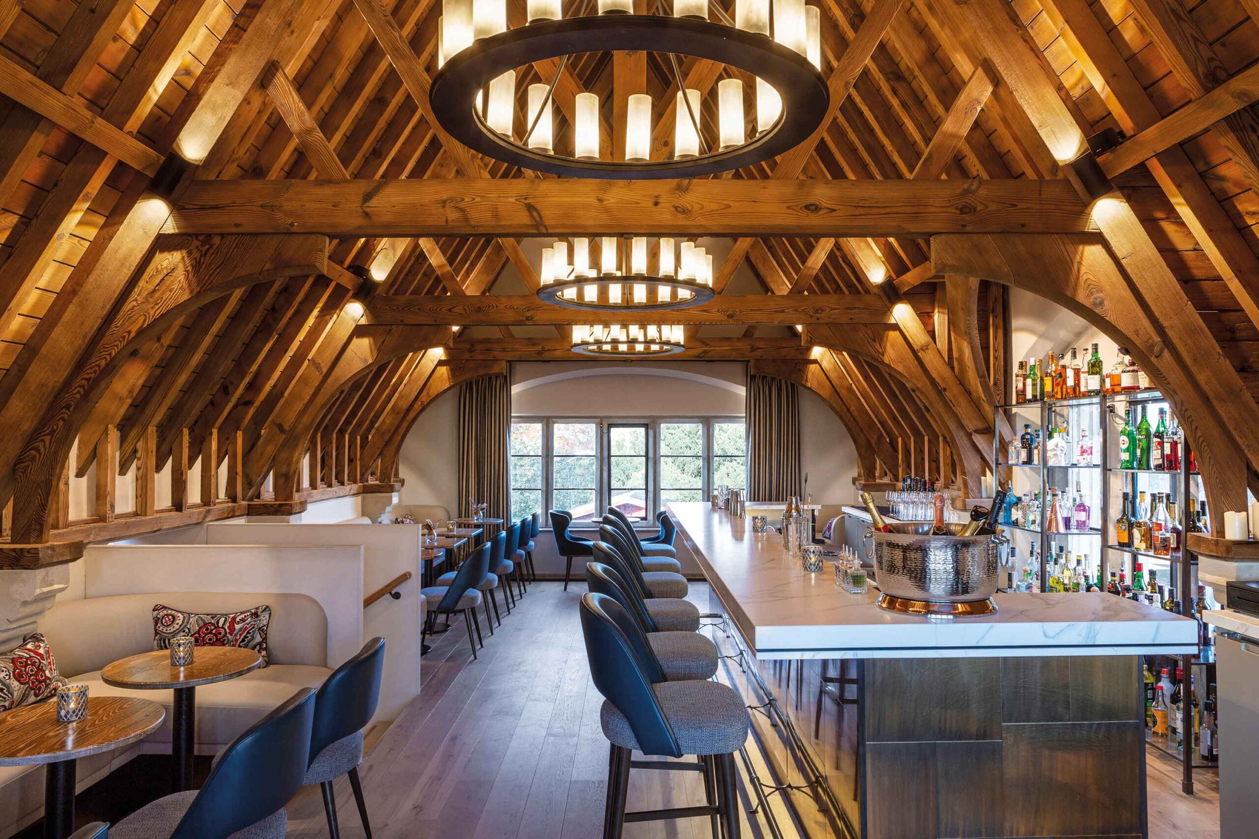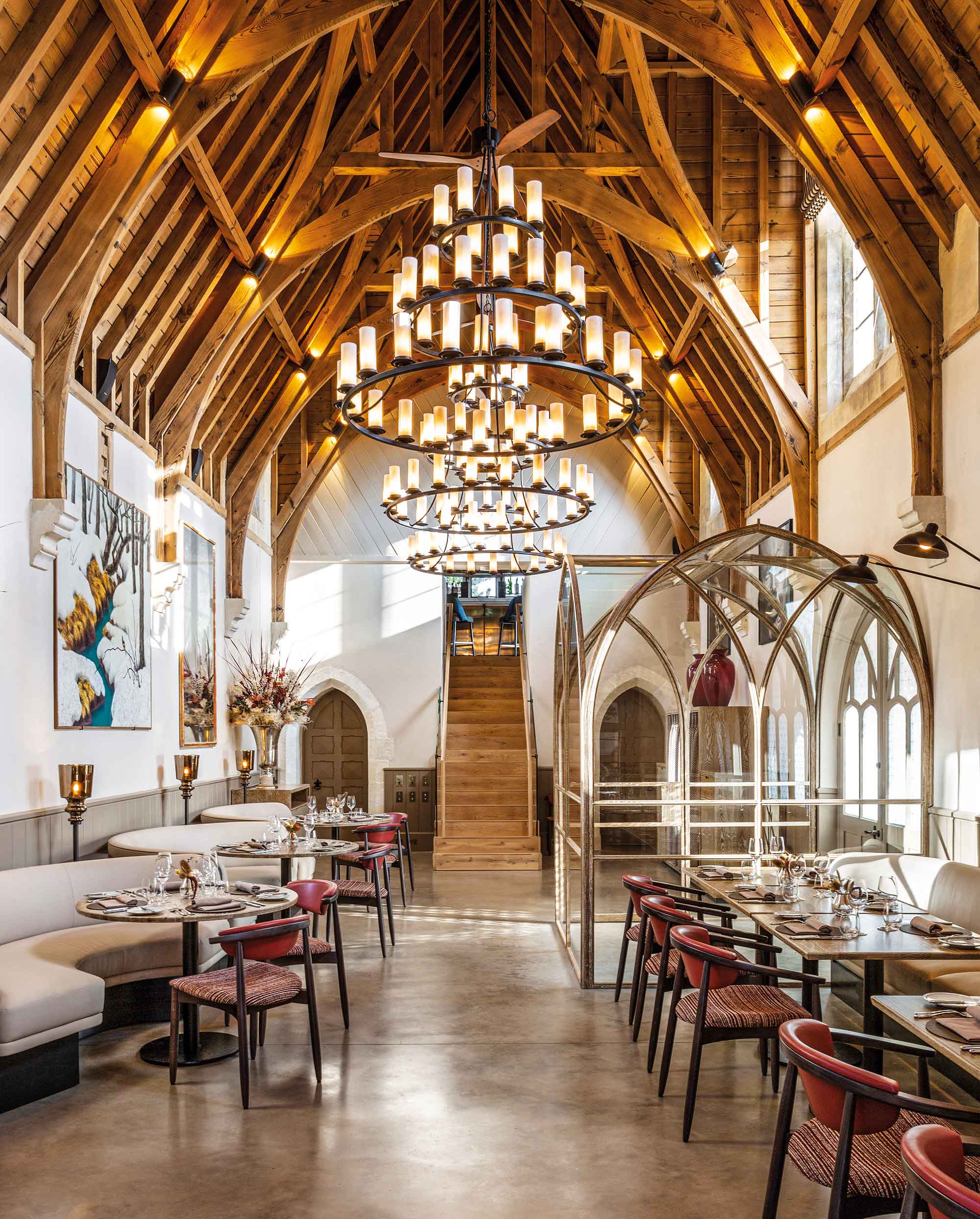 En cuanto a los detalles, se ha restablecido el plano histórico original y las proporciones del comedor central y oeste, mientras que el salón este ahora alberga la cocina principal y una nueva barra en el entrepiso. El distintivo techo de madera con vigas se encuentra escondido debajo de un techo suspendido monótono, un remanente de esa deprimente oficina de los 80. El resultado es un restaurante lleno de carácter. El intrincado techo proporciona una razón más que suficiente para mirar hacia arriba.