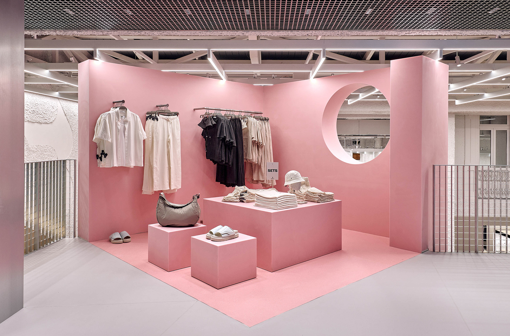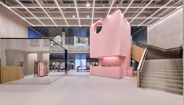Para este espacio, se ha instalado un volumen geométrico de grandes dimensiones, y a dos alturas, además de mobiliario construido con Krion® Lux en una tonalidad rosa. Este proyecto requería de un código de color específico, para el cual, la firma de PORCELANOSA Grupo ha trabajado en su personalización, de acuerdo a las necesidades expuestas por el cliente. Esta tienda es un proyecto de Bershka, con la colaboración del estudio CuldeSac.