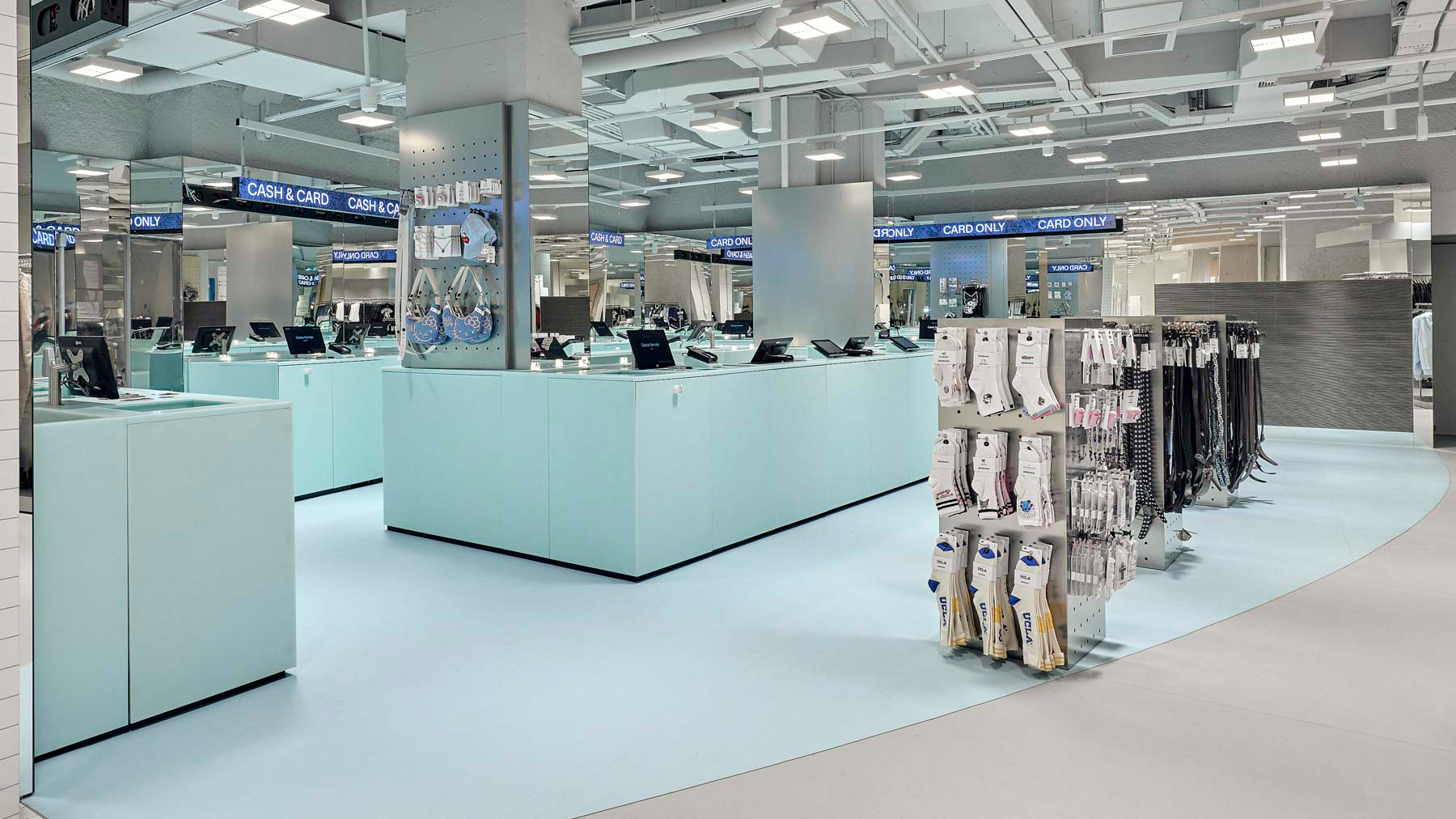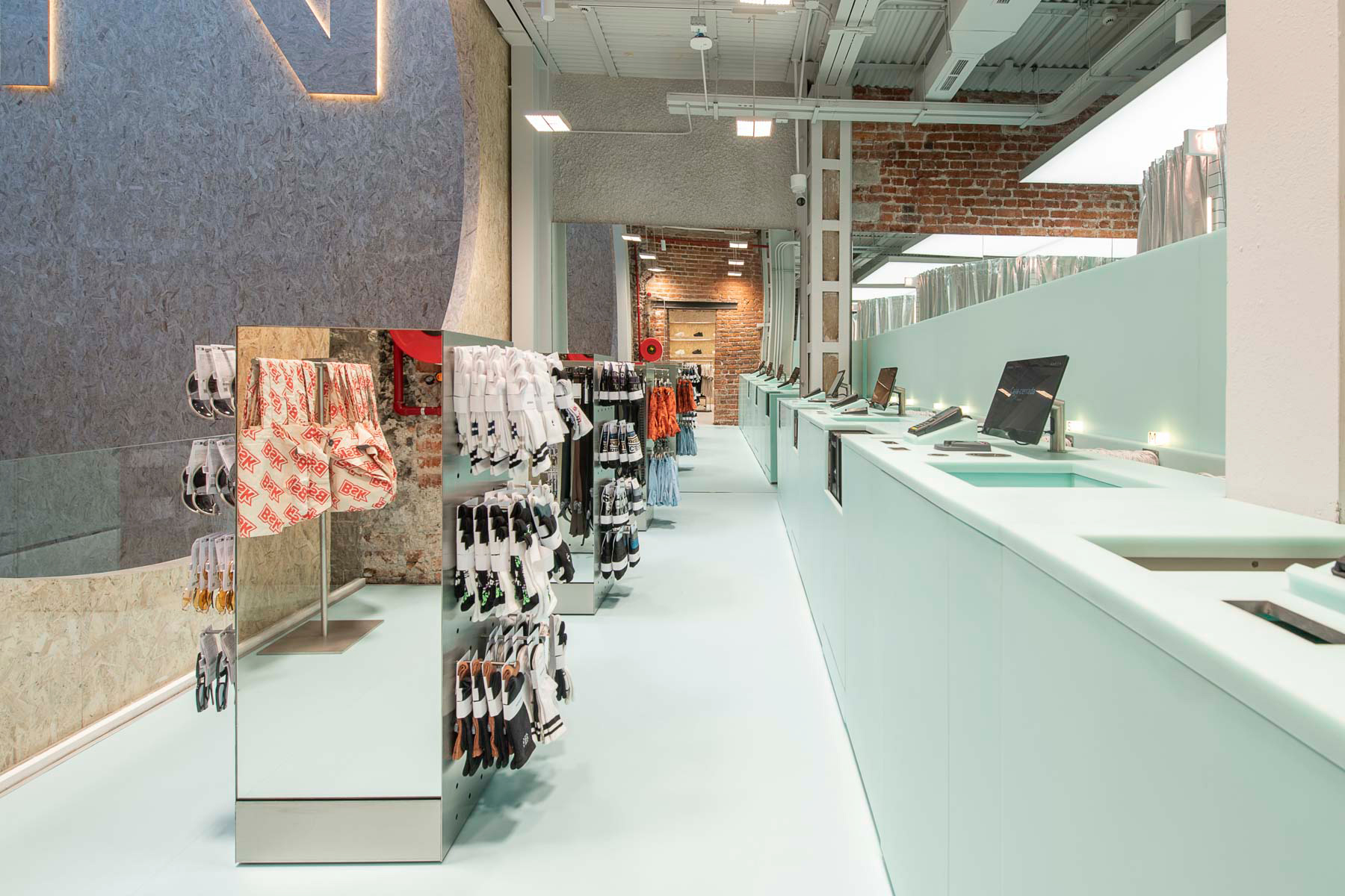 La renovada flagship store de BERSHKA en París se sitúa en la rue de Rivoli, muy cerca de las Tullerías, el Louvre o la Place Vendôme. Una zona que este año, además, tiene especial protagonismo debido a la organización de los Juegos Olímpicos en la capital francesa. Para la tienda parisina, se ha decidido aportar un toque distintivo con el uso de mobiliario recubierto de la superficie sólida Krion® Lux 4601 Green Light. Su tono azul turquesa tiene continuidad en el pavimento y confiere una identidad propia a áreas concretas, como ocurre en la zona de cajas.