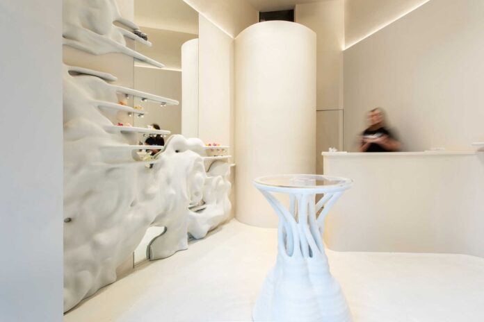 External Reference ha contado para este proyecto con la experiencia de LaMáquina y ha utilizado una celulosa tratada con Pure.Tech para realizar el mobiliario a medida. La geometría y el dinamismo que recuerdan la naturaleza orgánica de los motivos florales se conectan así con imprescindibles valores de sostenibilidad ambiental.