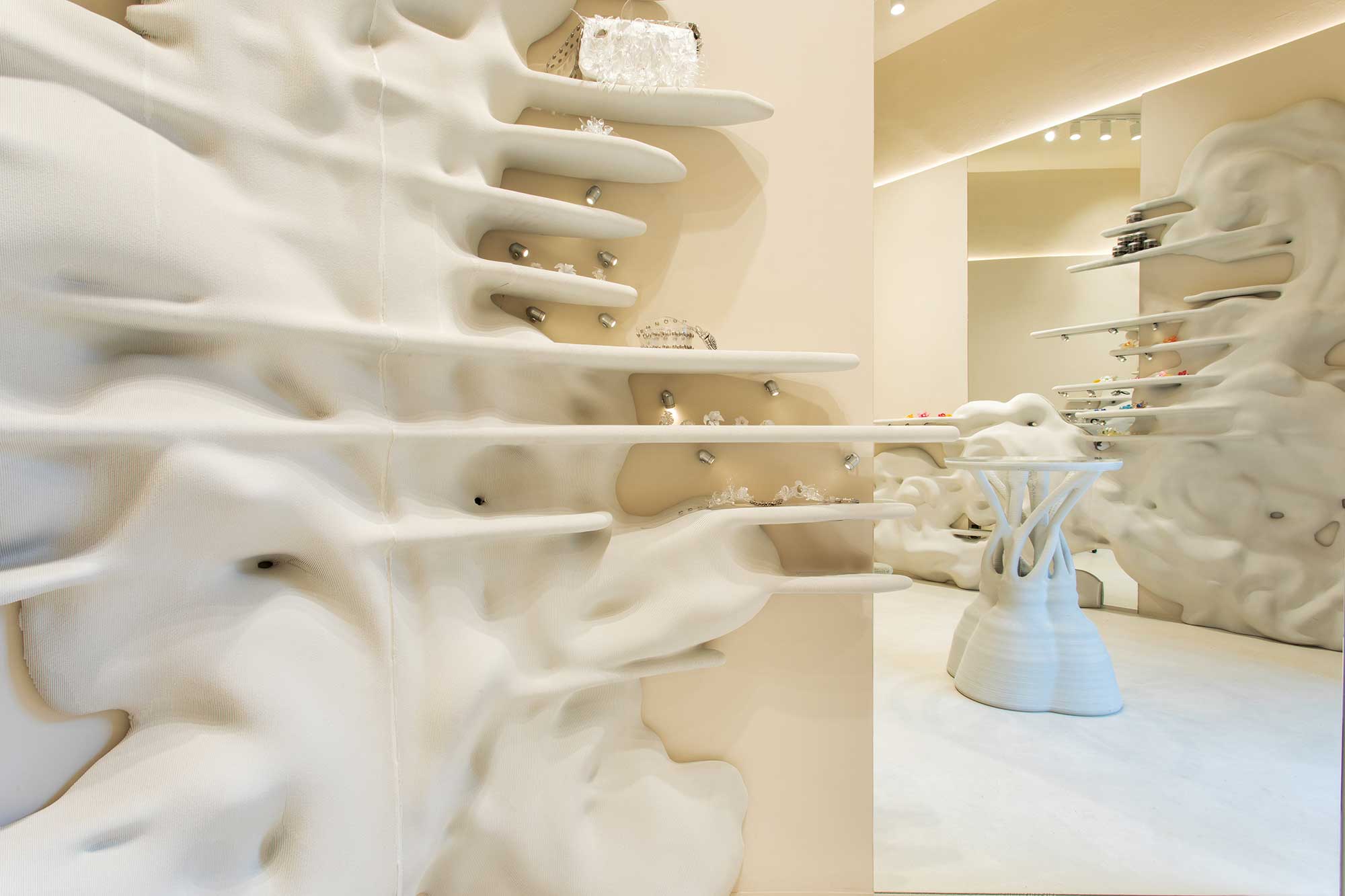 El interior de la tienda se convierte en una extensión del exterior ya que las formas orgánicas se apoderan del espacio y las ornamentaciones de la fachada pasan a ser unos grandes rosetones con glitches futuristas, unos bajorrelieves a diferentes alturas (de 90 cm a 1,70 m) que albergan, alrededor de una pequeña mesa de centro, las joyas y accesorios de La Manso cuidadosamente iluminados por mini focos orientables.